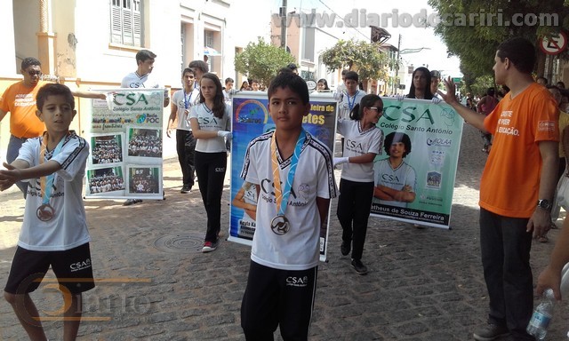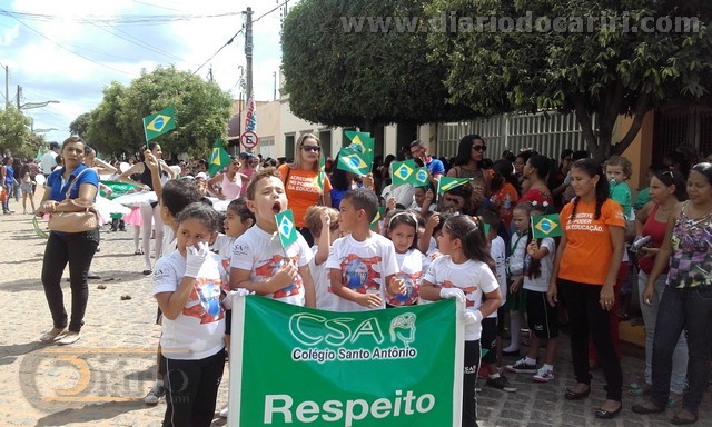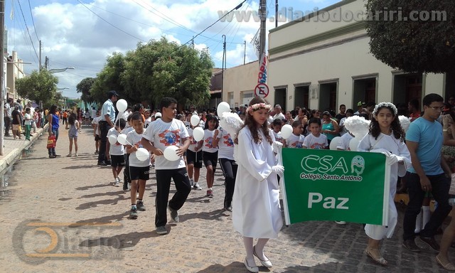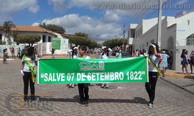 Colégio Santo Antônio na Rua do Vidéo Fotos:SilvaNetodiariodocariri.com 7 de setembro de 1822, foi importante data quando o príncipe regente Dom Pedro proclamou a Independência do Brasil. Quando ficou oficializado o rompimento do vínculo de dependência que o Brasil tinha com relação a Portugal. Daquela data ao dia 7 de setembro de 2015, já são 193 anos de Independência do Brasil. Em Barbalha a data cívica foi comemorada de forma antecipada da segunda-feira próxima para esta sexta-feira 4 de setembro, das 08 às 11 horas, com bonito desfile cívico na Rua do Vidéo, por Escolas Públicas e Colégios particulares de Barbalha. Desfilaram na manhã de hoje, o Colégio Nossa Senhora de Fátima, o Colégio Santo Antônio, a Escola de Ensino Médio Adauto Bezerra, a Escola de Ensino Médio Virgílio Távora, a Escola de Ensino Médio Almiro da Cruz, e a Escola de Ensino Fundamental Senador Martiniano de Alencar que colocou na Rua do Vidéo mais de 700 alunos, segundo a direção da Escola. Um bom público se fez presente e aplaudiu de maneira empolgante a passagem de cada colégio e cada escola. As Fanfarras deram shows à parte prestando homenagens a Terra adorada, Entre outras mil, És tu, Brasil, Ó Pátria amada! Dos filhos deste solo és mãe gentil, Pátria amada, Brasil! Silva Neto