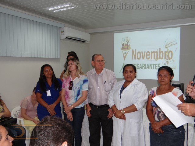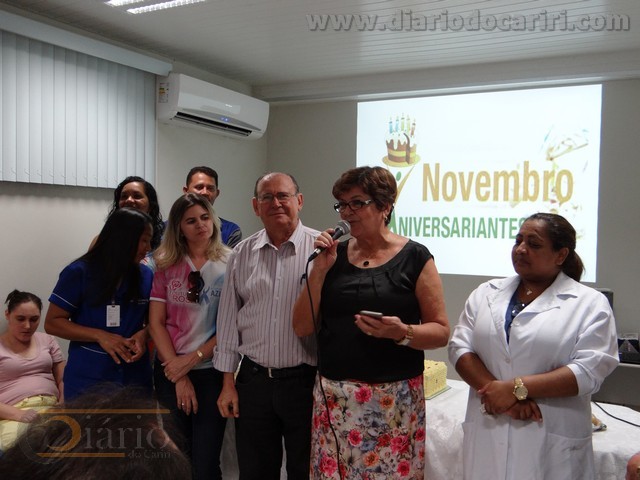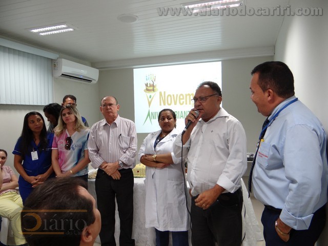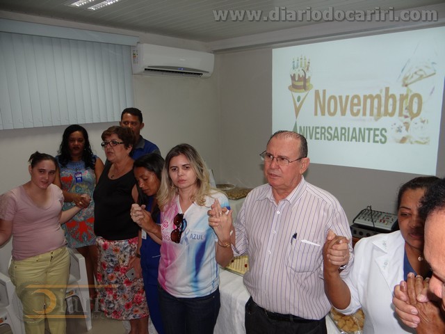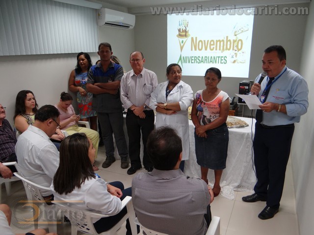 Aniversariantes cortam o bolo fotos:SilvaNeto/diariodocariri.com No final da tarde dessa quinta-feira, 26 de novembro, na Sala de Estudos e Pesquisas Dr. Antônio Correia Saraiva no Hospital Santo Antônio de Barbalha, a Fundação Otília Correia Saraiva reuniu diretores, colaboradores e convidados para celebrar com alegria data natalícia dos aniversariantes do mês de novembro. Além do diretor do Hospital do Coração do Cariri (HCC), Dr. João Correia Saraiva, cerca de outros 10 colaboradores de repartições da área de saúde da Fundação Otília Correia Saraiva também receberam homenagens pela data de aniversário no decorrer do mês de novembro, isso acontece a cada mês uma forma carinhosa e muito gentil dos diretores do Hospital Santo Antônio e do Hospital do Coração do Cariri. A solenidade festiva contou com a presença da vice-prefeita Maria Betilde Sampaio Correia, familiares do Dr. João Correia Saraiva, Dr. José Correia Saraiva e família, colaboradores de vários setores e convidados dentre eles o amigo Murilo Siqueira da Rádio Padre Cícero PF de Juazeiro do Norte. Os aniversariantes foram homenageados com homenagens por escrita, no uso da palavra de amigos e amigas, dentre as quais falaram Dr. José Correia Saraiva, Murilo Siqueira, Betilde Correia, Egberto Santos e Dr. João Correia Saraiva. Na oração os aniversariantes de mãos dadas pediram a Deus que toda família médica promova o bem pela vida, paz espiritual e sabedoria para clinicar e curar os males da matéria humana, após a oração se deu o clima festivo com todas as vozes cantando parabéns pra você, corte do bolo pelos aniversariantes e um coquetel servido aos presentes. O s trabalhos da festiva dos aniversariantes foram dirigidos pelo versátil amigo George Pereira. PARABÉNS ANIVERSARIANTES! Silva Neto