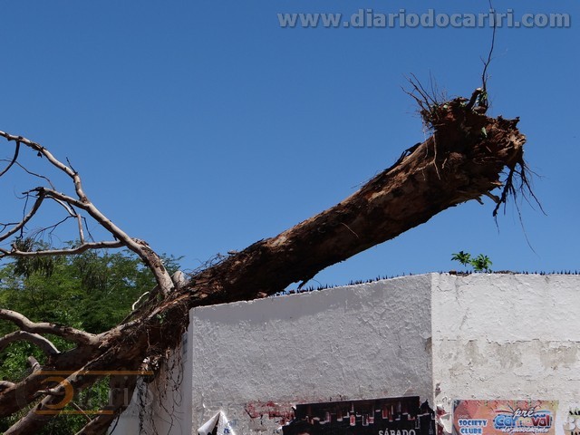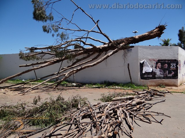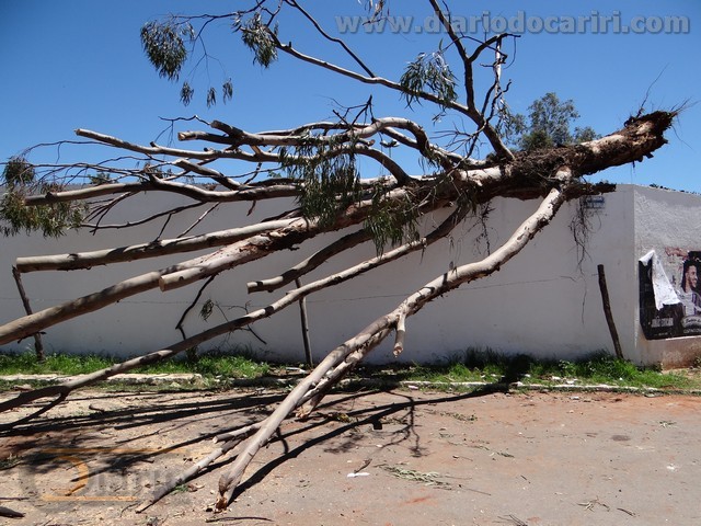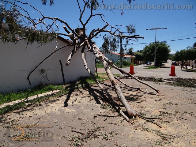 Eucalipto arrancado pelo tronco Fotos:SilvaNeto/diariodocariri.com Um espetáculo jamais imaginado pela população de Barbalha a qual foi surpreendida com uma forte ventania a noite da última sexta-feira, 29/01, a natureza fez estragos na própria natureza, arrancando árvores, e de residências fazendo telhas voarem como um simples papel. No Parque da Cidade Tasso Ribeiro Jereissati, que tem pés de eucaliptos e outras árvores de menor porte, um grande eucalipto foi arrancado pela raiz e arremessado sobre o muro, pela frondosa árvore, os galhos ficaram para o lado de fora do muro obstruindo o tráfego de veículos pela Rua Dr. Pio Sampaio. A secretaria de Infraestrutura e Obras do município entrou em ação serrando os galhos e desobstruindo a via pública que liga várias comunidades com o centro da cidade de Barbalha. Também existem outras informações que a ventania arrancou árvores na região da Malhada, no início da rodovia Barbalha/Arajara próximo ao Colégio Santo Antônio, e também em outras localidades na zona rural de Barbalha. A ventania que cruzou Barbalha em poucos minutos, fez estragos, causou medo e deixou a população preocupada. Porém, não houve registro de pessoas feridas. Silva Neto