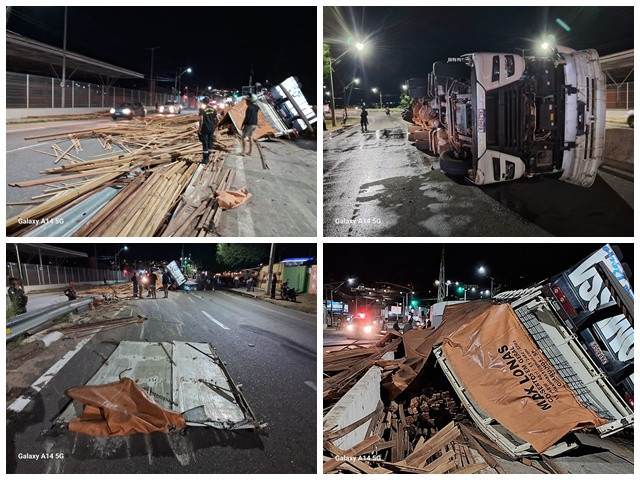 Por volta das 18h40min, na CE-060 pela Avenida Luiz Roberto Sampaio, no sentido Barbalha para saída de Missão Velha, em frente a nova Rodoviária de Barbalha, uma carreta de seis eixos tombou lateralmente com carregamento de madeira ripas, caibros e linhas, a madeira está espalha na pista.