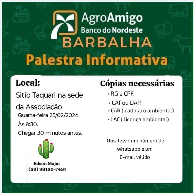 Portanto, nesta quarta-feira (25), a partir das 08hs da manhã na sede da Associação de Moradores e Produtores Rurais do Sítio Taquari, importante reunião do Banco do Nordeste com a equipe do Programa AgroAmigo para agricultores e agricultoras que querem trabalhar e produzir mais para aumentar a renda familiar.