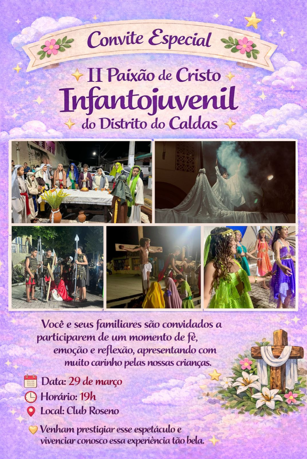 Essa história vai ser contada por um grupo infantojuvenil no Distrito do Caldas, no dia 29 de março, às horas da noite, no Club do Roseno. Você barbalhense desse grande pé de serra região do Caldas está convidado a prestigiar esse grupo infantojuvenil apresentando Paixão de Cristo.