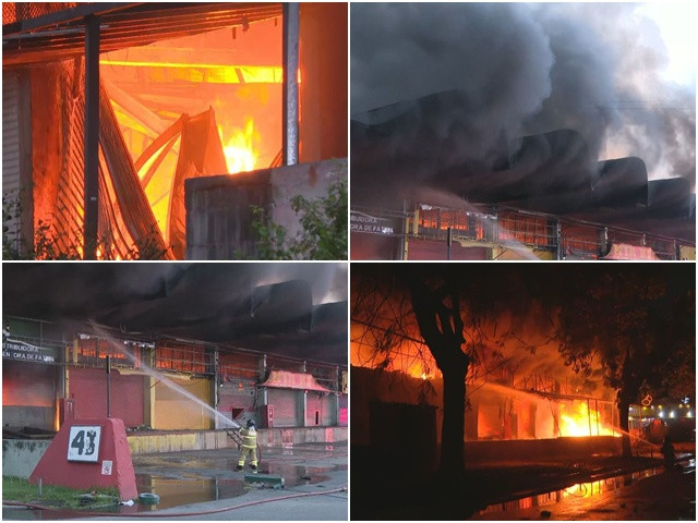 Em imagens do local, é possível ver as chamas tomando conta de vários galpões rapidamente