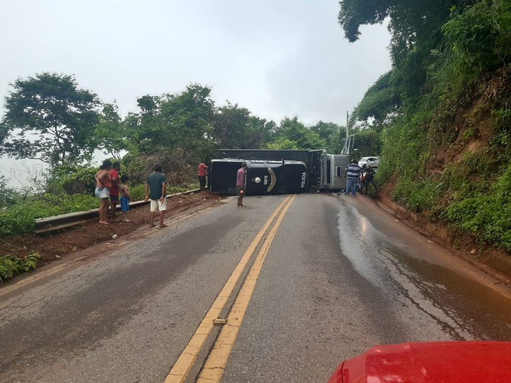 Um caminhão reboque que levava para o conserto um carro da Polícia Civil tombou na descida do maciço de Baturité, na rodovia estadual CE-356, na manhã desta quarta-feira (4). Segundo a polícia, o transporte estava com os pneus danificados, após terem sido cortados durante o motim dos PMs no Ceará.