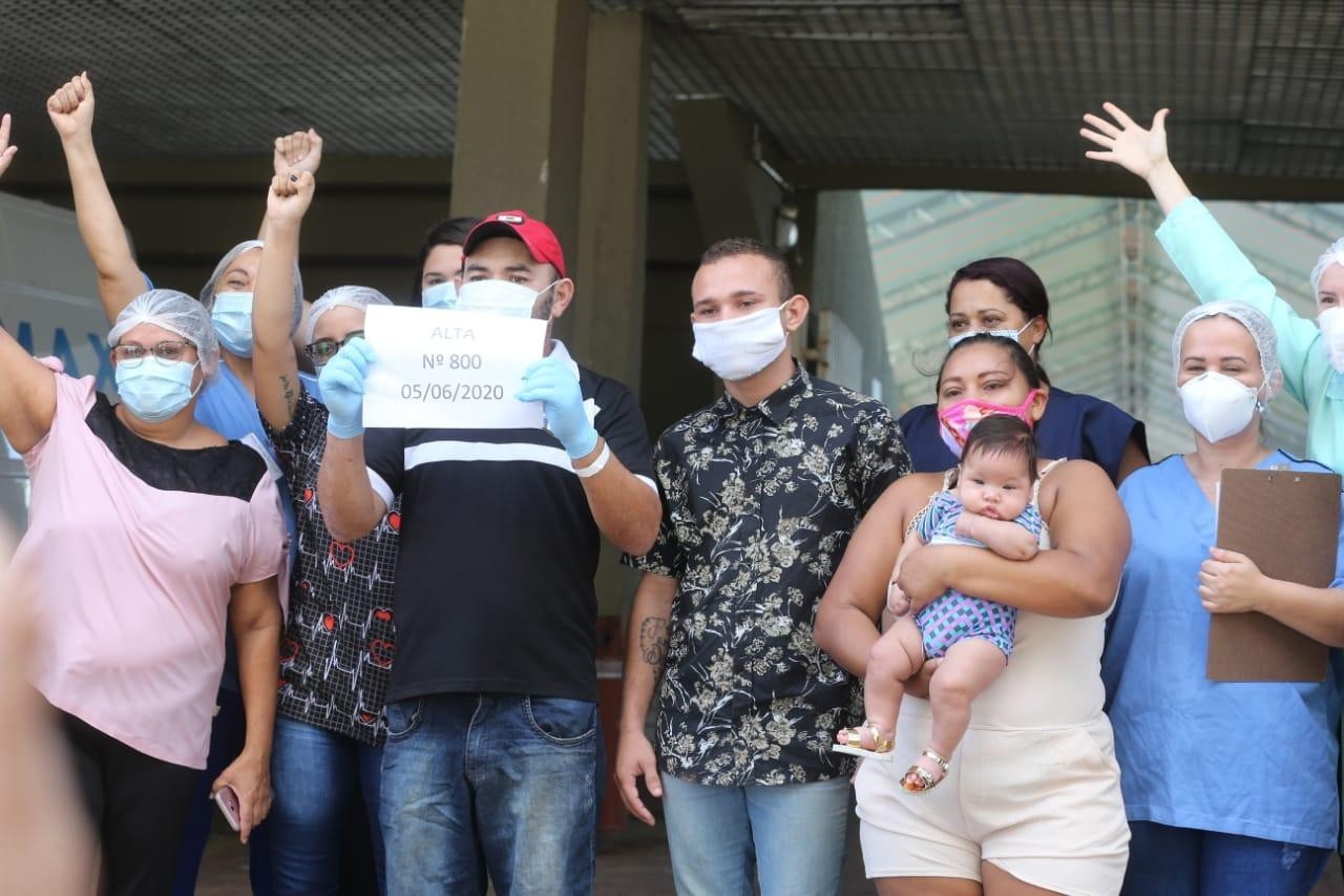 Legenda: Profissionais de saúde e família do paciente 800 a se recuperar comemoraram a alta hospitalar. Foto: José Leomar/SVM