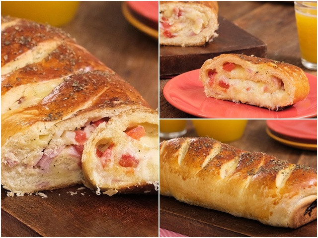 O pão recheado é uma sugestão prática e econômica para o lanche da tarde. O recheio é feito com ingredientes simples que você provavelmente tem em casa: queijo muçarela, presunto, tomate, cebola e orégano.