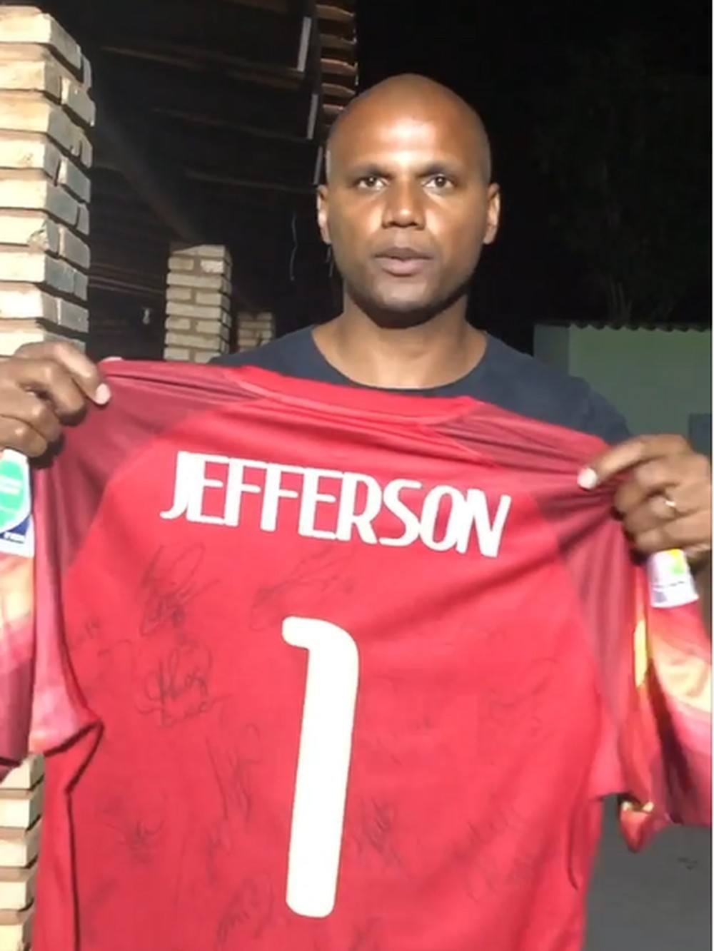 A camisa, um modelo na cor vermelha, tem o nome de Jefferson nas costas e os patches usados pela Seleção na Copa de 2014. E contém assinaturas de jogadores como Neymar, David Luiz, Thiago Silva, Julio Cesar, entre outros.