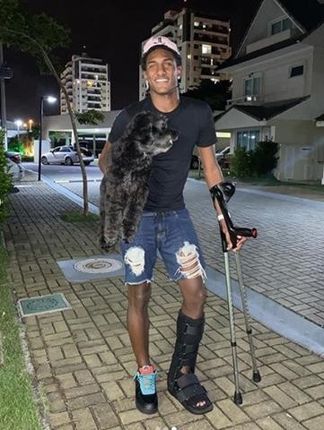 Thalles usava proteção na perna e muletas logo após a cirurgia — Foto: Reprodução