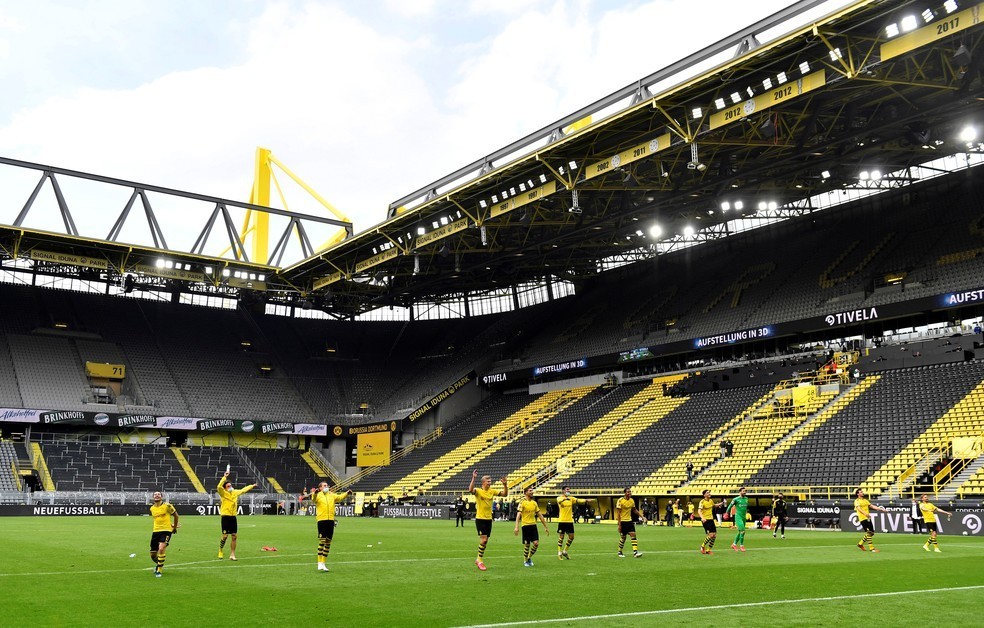 Após goleada, jogadores do Borussia aplaudem setor da Muralha Amarela, mesmo com arquibancadas vazias