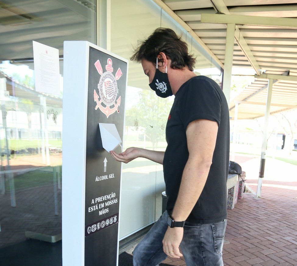 Duílio Monteiro Alves, diretor de futebol do Corinthians, higieniza a mão com álcool gel — Foto: Rodrigo Coca/Ag. Corinthians