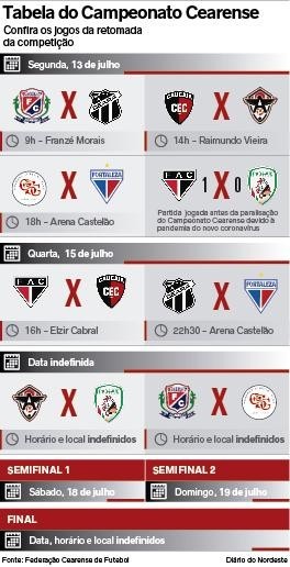 Datas definidas, locais escolhidos e horários acertados. Está tudo pronto. A bola vai voltar a rolar pelo Campeonato Cearense. A Federação Cearense de Futebol (FCF) divulgou a tabela da retomada do Estadual, ontem, com os detalhes do restante da competição, que terá uma verdadeira maratona de jogos e importantes definições já nos próximos dias, inclusive a disputa do Clássico-Rei, tudo com cobertura especial do Sistema Verdes Mares.