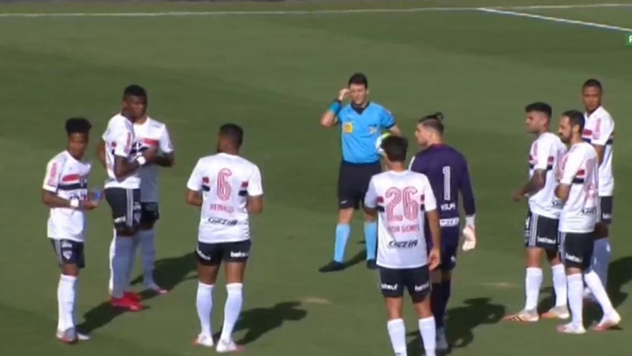 Legenda: Atletas do São Paulo entraram no gramado, mas foram informados da suspensão da partida - Foto: Foto: Reprodução/Premiere