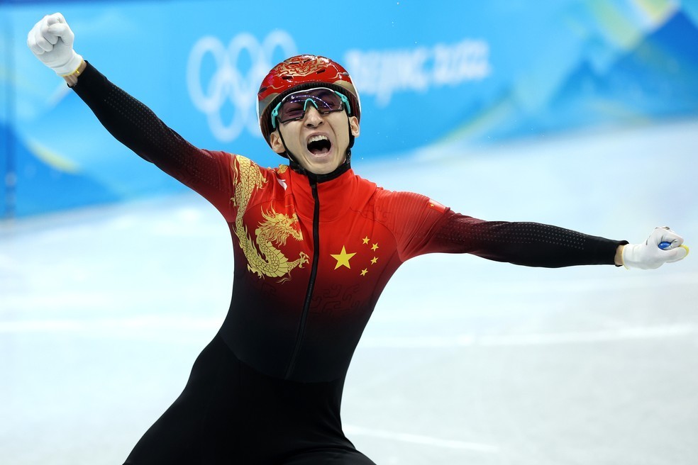 Daijing Wu comemora o ouro da China no revezamento misto da patinação nas Olimpíadas de Inverno — Foto: Getty Images