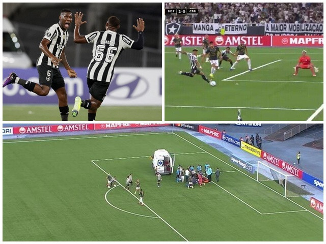 Ambulância socorre o zagueiro Neira, do Carabobo, após choque de cabeça com Mastriani, do Botafogo