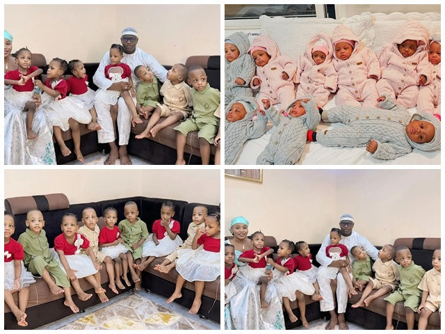 Nas fotos, Halima Cissé e Abdelkader Arby, pais dos bebês, surgem ao lado dos nove filhos. Quando nasceram, eles pesaram entre 500g e 1 kg. Hoje, estão fortes e saudáveis.