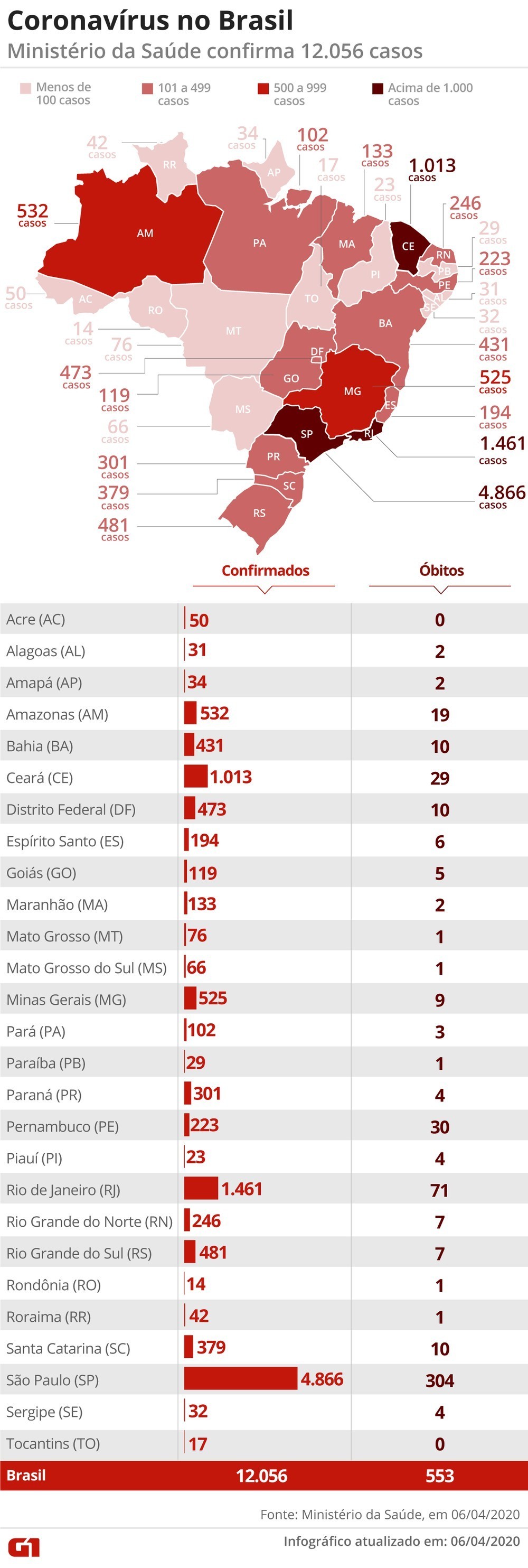 Brasil tem 553 mortes e 12.056 casos confirmados de coronavírus, diz Ministério da Saúde