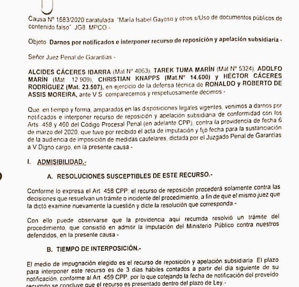 Durante a audiência deste sábado, os advogados que defendem Ronaldinho Gaúcho e Assis no Paraguai apresentaram um recurso que contesta essa decisão do juiz Mirko Valinotti, contrária à sugestão inicial do Ministério Público. A Procuradora-Geral do Estados, Sandra Quiñonez, determinou a substituição dos promotores do caso.