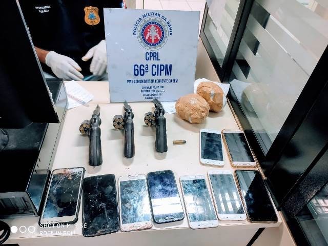 Ainda segundo a assessoria, com o trio foi apreendido: nove celulares, 120 buchas de maconha e três armas de fogo (um revólver calibre .38, com cinco munições deflagrados e uma intacta; um revólver calibre .38, com quatro munições deflagradas e duas intactas e um revólver calibre .38, com quatro munições deflagradas e duas intactas).