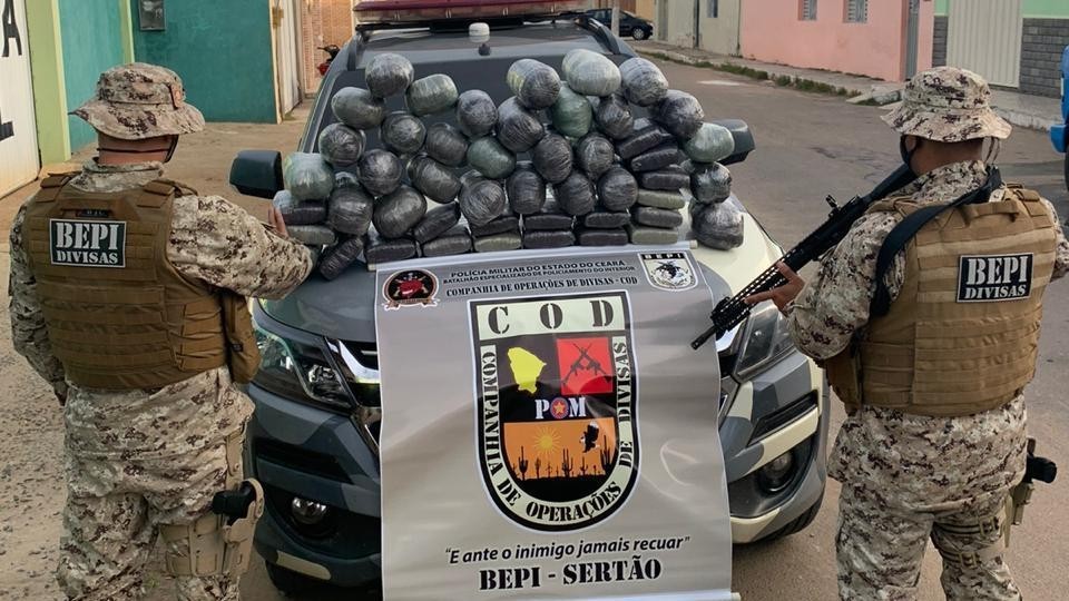 A Companhia de Operações de Divisas, da Polícia Militar do Ceará (PMCE), apreendeu 49,8 kg de maconha, ao abordar um veículo em uma barreira sanitária (montada para diminuir o fluxo de pessoas e evitar o contágio da Covid-19), no Município de Brejo Santo, na tarde deste sábado (18).