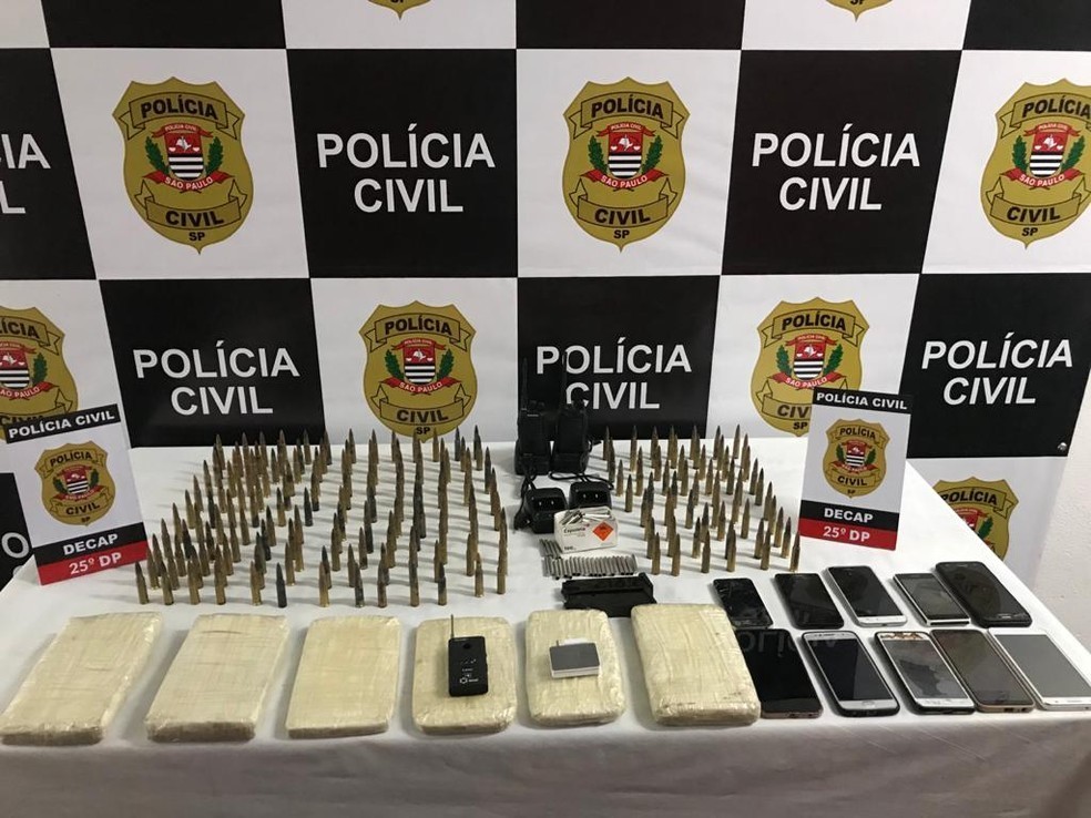 Celulares, armas e um carro foram localizados com a suspeita de participar da logística do crime — Foto: Polícia Civil/divulgação