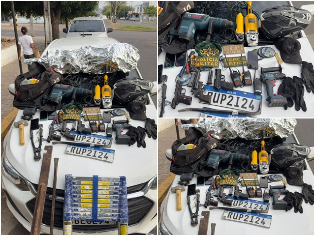 Averiguando o interior do veículo os policiais encontraram: 1 pistola 380 com várias munições, 1 revólver 38 com várias munições, 1 simulacro de pistola e vários materiais que seriam usados para realizar o arrombamento do banco entre eles um martelete elétrico, serra elétrica, vários discos de serra entre outros objetos.
