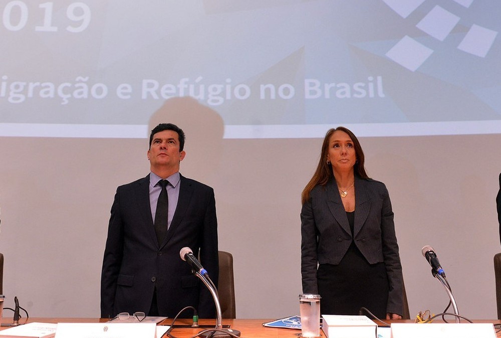 O ministro da Justiça e Segurança Pública, Sergio Moro, ao lado da então secretária Nacional de Justiça Maria Hilda Marsiaj Pinto, em evento de 2019
