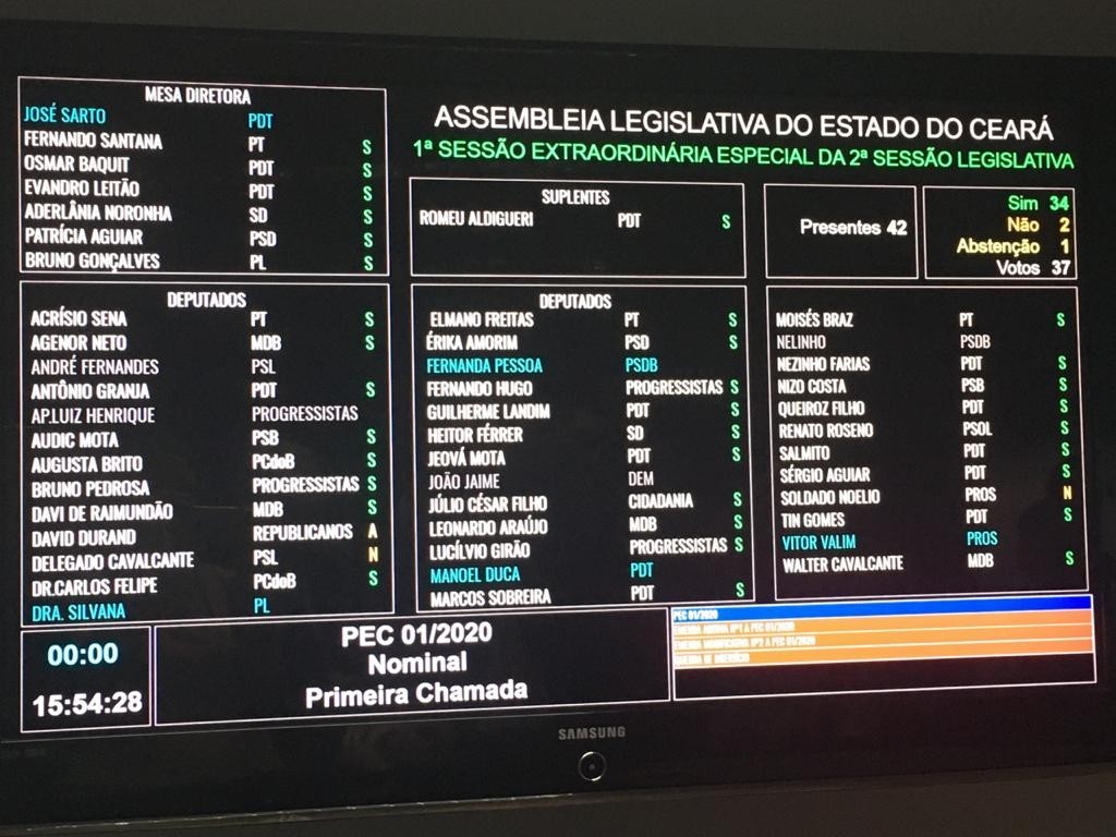 A PEC foi aprovada em dois turnos por 34 votos a favor, dois contrários e uma abstenção. A matéria recebeu duas emendas. A emenda nº 01/2020, de autoria do deputado Guilherme Landim, proíbe a tramitação legislativa de projetos que concedam aumento remuneratório ou vantagens funcionais para policiais e bombeiros militares em situações de motins, paralisações e revoltas. Contudo, o texto não atinge a mensagem 8484, de reestruturação da carreira militar, que já está tramitando na Assembleia.