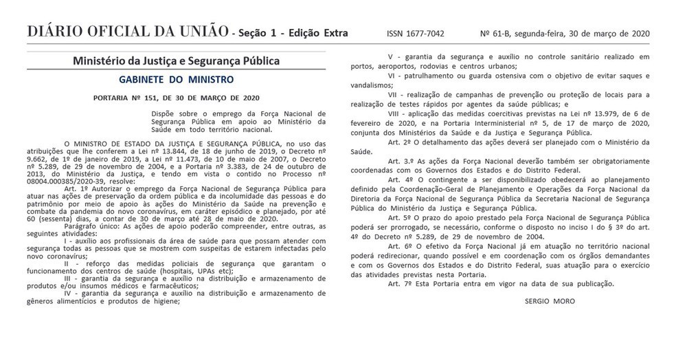 Uma portaria do ministro da Justiça e Segurança Pública, Sérgio Moro, autorizou nesta segunda-feira (30) o emprego da Força Nacional de Segurança Pública para dar apoio ao Ministério da Saúde nas ações de combate ao novo coronavírus.