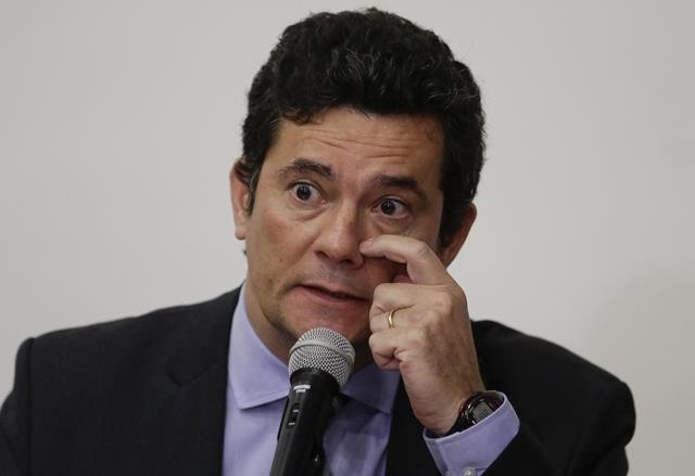 Sérgio Moro durante anúncio da saída do ministério da justiça nesta sexta-feira (24) — Foto: Eraldo Peres/AP