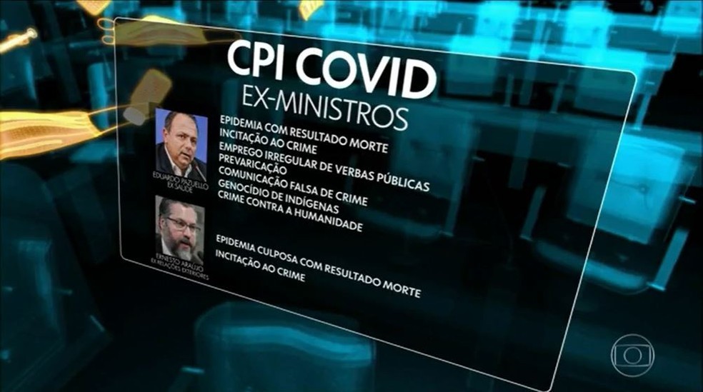 Os ex-ministros Eduardo Pazuello e Ernesto Araújo devem ser alvo de pedidos de indiciamento feitos pela CPI da Covid. — Foto: Reprodução/TV Globo