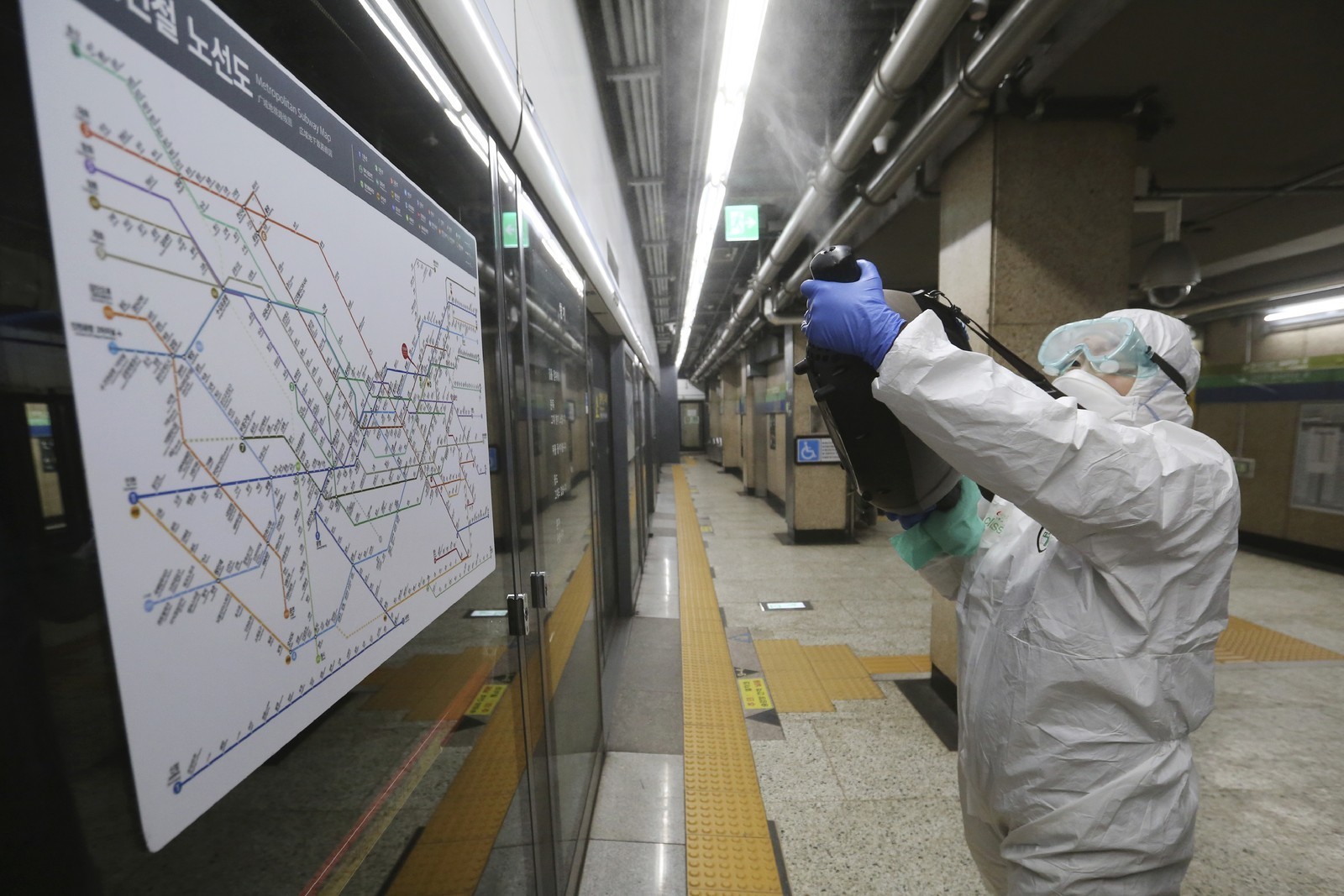Agente usa desinfetante spray em estação de metrô em Seul, na Coreia do Sul, nesta sexta-feira (21), como tentativa de prevenir a disseminação do novo coronavírus. — Foto: Ahn Young-joon/AP