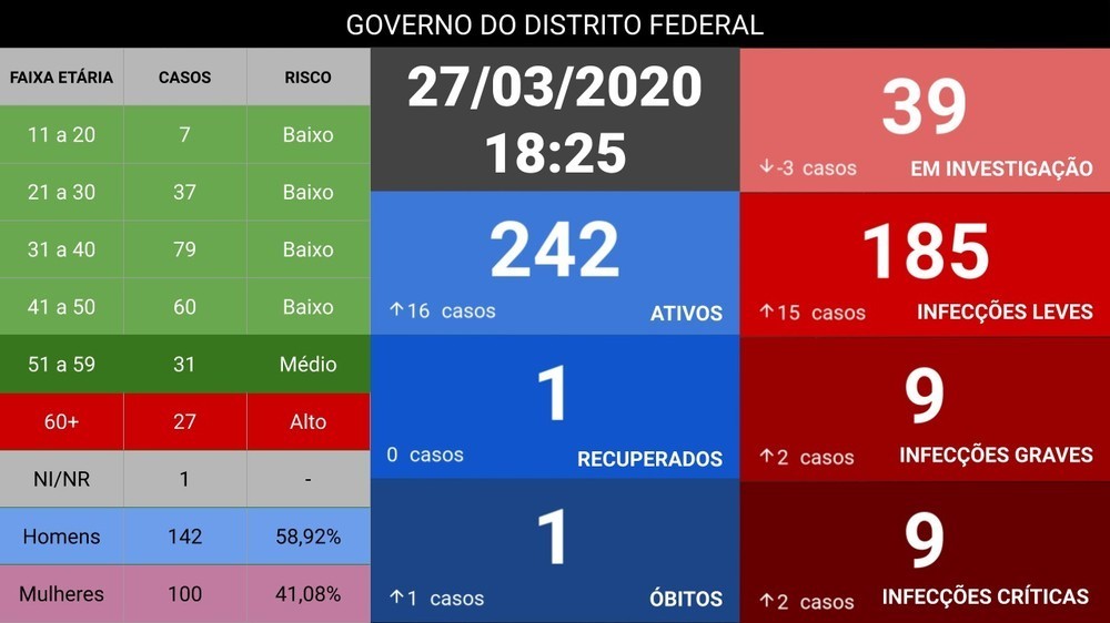 De acordo com o boletim divulgado no começo da noite, o Distrito Federal soma 242 casos de coronavírus. Dos infectados, 58,92% são homens e 41,08% são mulheres.