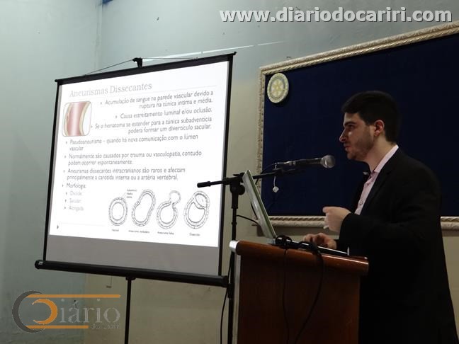 Para o bom público presente o doutor José Júnior, fez uma maravilhosa explanação sobre as causas sintomáticas, a evolução de cada quadro da doença pelos diferentes tumores, o rompimento de vasos diante a compressão sanguínea, o agravamento da aneurisma quando o paciente tem quadro de pressão alta, álcool e cigarro são fatores de risco para um aneurisma, as intervenções cirúrgicas e suas evoluções no mundo cientifico.