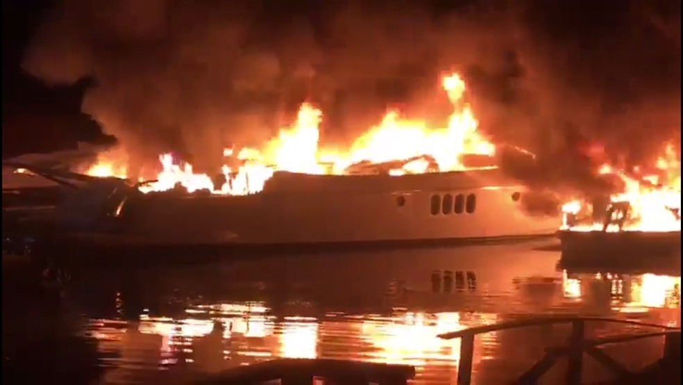 Imagens nas redes sociais mostram duas lanchas grandes sendo consumidas pelo fogo — uma estava atracada, e a outra, à deriva.