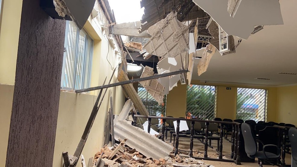 O teto do prédio onde funciona a Câmara Municipal de Tianguá, no interior do Ceará, desabou após chuva e ventos fortes na noite deste domingo (24). O prédio possui infraestrutura antiga e já apresentava rachaduras. Por conta disso, chegou a ser interditado pela Defesa Civil do Município, em 8 de maio. No momento do incidente ninguém se encontrava no local.