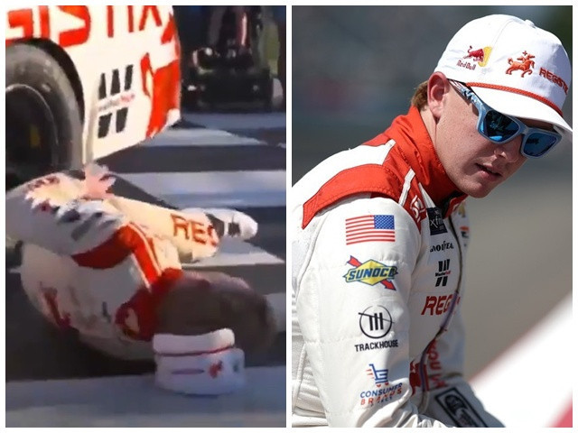 Connor Zilisch caído no chão após sofrer queda na comemoração de uma vitória — Foto: Reprodução