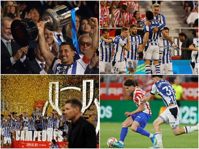 A Real Sociedad é campeã da Copa do Rei pela quarta vez! Depois de abrir o placar aos 14 segundos de jogo e estar à frente por duas vezes, a equipe do País Basco levou o empate por 2 a 2 no fim do tempo regulamentar, sofreu bastante na prorrogação, mas levou o título nos pênaltis. O herói dos bascos tem nome e sobrenome: Unai Marrero, que pegou duas cobranças, uma delas de Julián Álvarez, um dos melhores do Atlético de Madrid - Sorloth perdeu o outro.